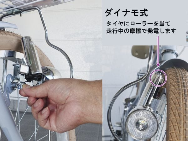 自転車が進むときに前輪が回転する力を利用して発電点灯。