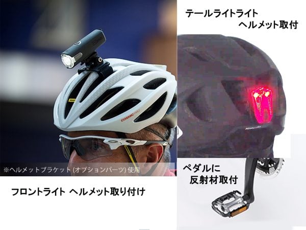 o ヘルメットライト/ヘルメット反射シール:視線の高さで光るので発見されやすい。