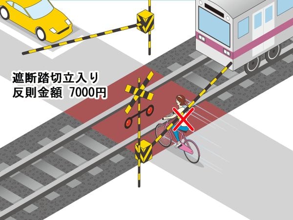 踏切のしゃ断機や警報機が作動している間は、その踏切に入ってはならない。